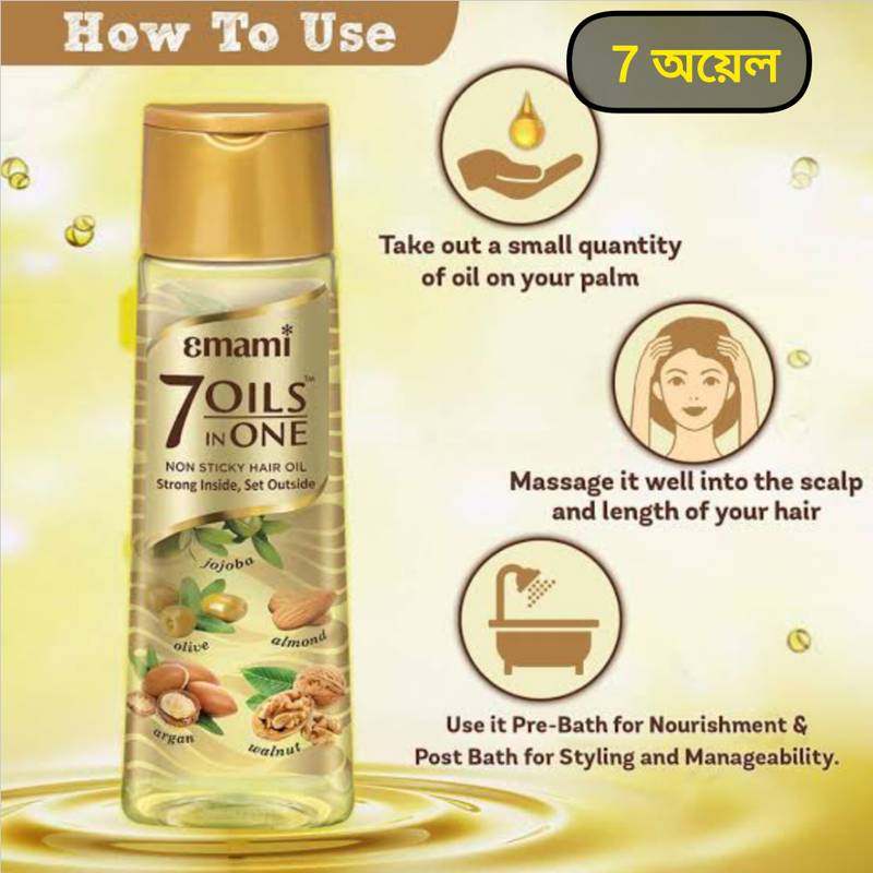 7 Oil একটি প্রিমিয়াম হারবাল হেয়ার অয়েল, যেখানে রয়েছে সাত ধরনের তেল—নারিকেল, বাদাম, আমলকি, ভৃঙ্গরাজ, মেথি, আমলকি ও তিল তেল। এই সমন্বয় চুলের গোড়া মজবুত করে, নতুন চুল গজাতে সাহায্য করে এবং স্কাল্পের শুষ্কতা ও খুশকি দূর করে। নিয়মিত ব্যবহারে চুল হয় মসৃণ, ঝলমলে এবং ঘন। সব ধরনের চুলের জন্য উপযোগী।